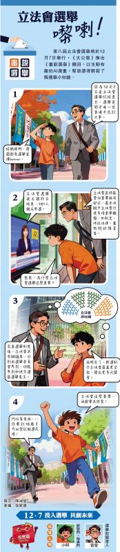 第八屆立法會選舉將於12月7日舉行,《大公報》推出《畫說選舉》欄目,以生動有趣的AI漫畫,幫助讀者輕鬆了解選舉小知識。