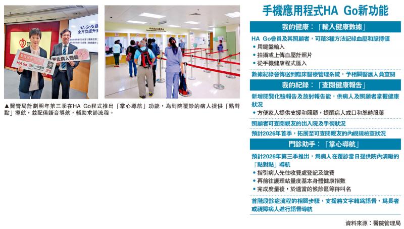 病人覆診時,往往需在醫院內不同地點的收費處、護理站、候診區等地點進行求診,步驟繁瑣。醫管局總行政經理(醫療信息)陳嘉賢昨日表示,為減輕病人奔波,局方正研發HA Go門診助手「掌心導航」,為病人在覆診當日提供「點對點」的院內導航及清晰的診症流程的提示,目標在明年第三季推出。