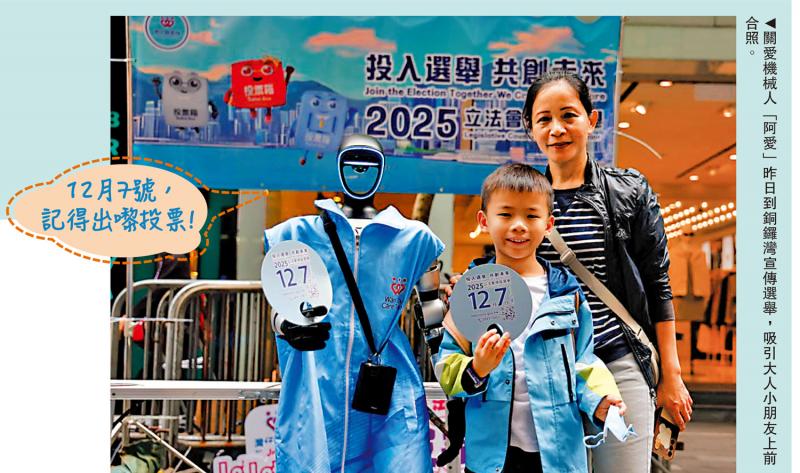 「12月7號,記得出嚟投票!」銅鑼灣鬧市昨日出現立法會選舉「宣傳新星」──關愛機械人「阿愛」與灣仔關愛隊出動宣傳12月7日投票,沿途引起市民圍觀。有市民認同以「阿愛」宣傳選舉可帶來話題,亦增添親切感。