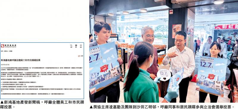 左圖:新鴻基地產發新聞稿,呼籲全體員工和市民踴躍投票。右圖:房協主席凌嘉勤及團隊到沙田乙明邨,呼籲同事和居民踴躍參與立法會選舉投票。