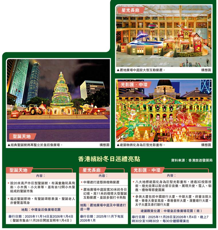 香港旅遊發展局的「香港繽紛冬日巡禮」,今年重返中環舉行。中環皇后像廣場花園和遮打道將分別化身為「聖誕天地」及「星光長廊」,設有20米高的聖誕樹、聖誕市集及燈飾裝置;中環八大地標建築,包括中國銀行大廈、終院大樓、香港大會堂等,每晚將上演「光影匯.中環」3D投影燈光表演。旅發局亦會聯同業界推出逾300項優惠,涵蓋餐飲、購物、景點及交通。\大公報記者 鄭文迪
