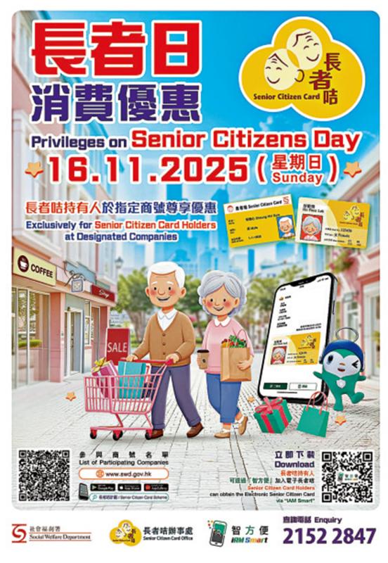 【大公報訊】記者戴靜文報道:11月16日是「長者日」,社會福利署昨日表示,全港18區超過400間機構和商戶參與「長者日消費優惠」活動(圖),約3800間店舖當天在門市展示優惠內容及使用條款或細則。港鐵公司表示,65歲或以上的人士,當日憑樂悠咭、長者八達通或個人八達通,可免費乘搭港鐵、輕鐵及港鐵巴士,但不包括機場快綫、東鐵綫過境車程、頭等及高鐵。