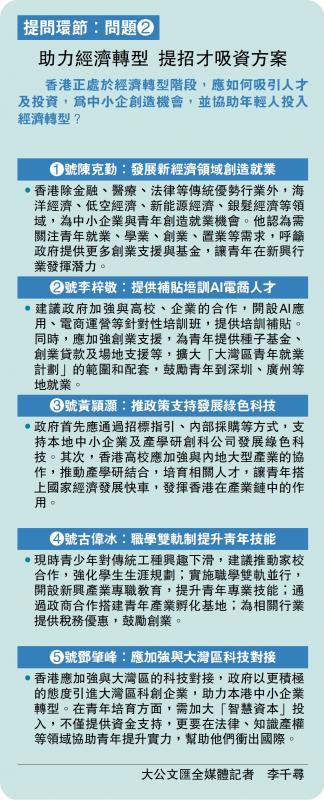 •香港除金融、醫療、法律等傳統優勢行業外,海洋經濟、低空經濟、新能源經濟、銀髮經濟等領域,為中小企業與青年創造就業機會。他認為需關注青年就業、學業、創業、置業等需求,呼籲政府提供更多創業支援與基金,讓青年在新興行業發揮潛力。