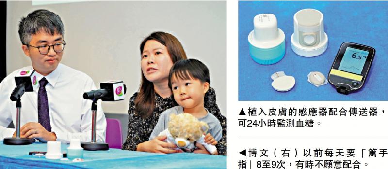 左圖:博文(右)以前每天要「篤手指」8至9次,有時不願意配合。 右圖:植入皮膚的感應器配合傳送器,可24小時監測血糖。