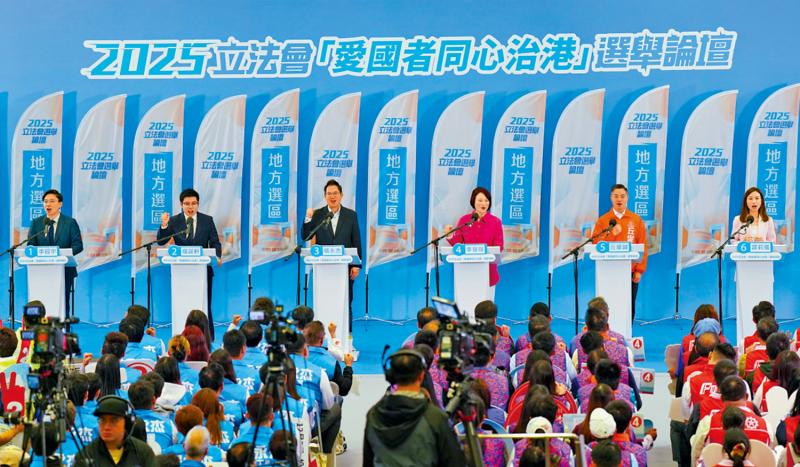 圖:2025立法會選舉九龍中地方選區論壇昨日上午在界限街一號體育館舉行。該區是地方直選競爭最激烈選區,一共由六名候選人競逐兩個議席。\中通社