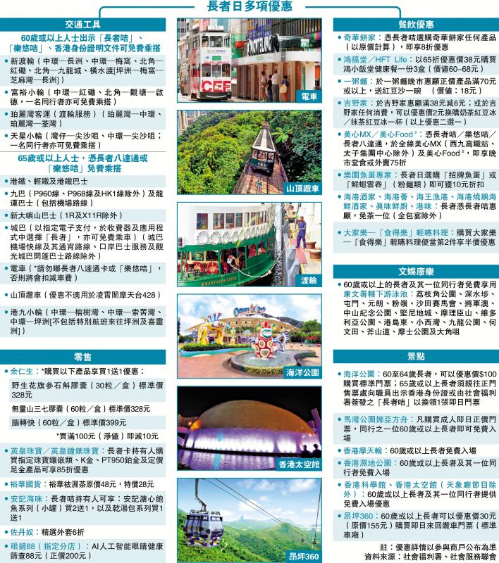 明日是一年一度的長者日,全港約3800間食肆及商戶,向持有長者咭或樂悠咭的「老友記」提供餐飲及消費優惠,向長者表達敬意和關懷。此外,「老友記」可免費乘搭渡輪、港鐵等多項公共交通工具,多個景點、公共泳池及博物館等,亦可免費入場。