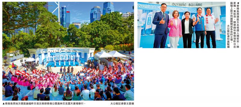 左圖:香港島西地方選區論壇昨日首次移師香港公園奧林匹克露天廣場舉行。\大公報記者蔡文豪攝;右圖:香港島西選區五名候選人楊哲安、陳家珮、黃秋萍、陳學鋒和郭偉强昨日在論壇上就不同議題闡述各自的立場。\大公報記者何嘉駿攝