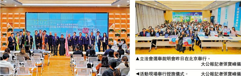 左圖:活動現場舉行授旗儀式。右圖:立法會選舉說明會昨日在北京舉行。\大公報記者張寶峰攝
