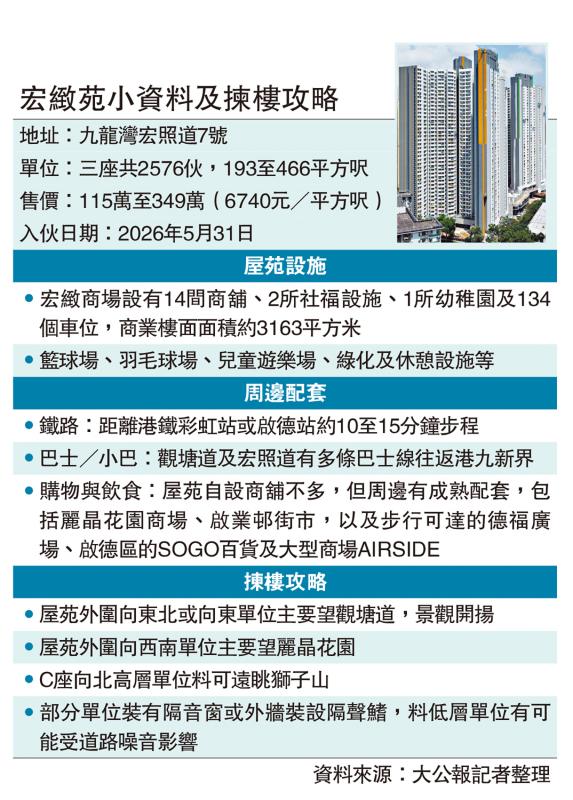 九龍灣宏緻苑共設三座,為39至41層高的住宅大廈,共提供2576伙,實用面積介乎193至466平方呎,售115萬至349萬。最新價單顯示,屋苑最平單位是C座13室,售114.92萬元,由於綠置居買家最低可支付樓價5%首期,即該單位只需57460元作為首期,料收入較低的人士亦能負擔,惟須注意該單位面積僅194平方呎,屬開放式單位,未必適合家庭客。該單位位處低層,且面對地庫停車場出入口,雖設有隔音窗,但預期會受噪音影響。