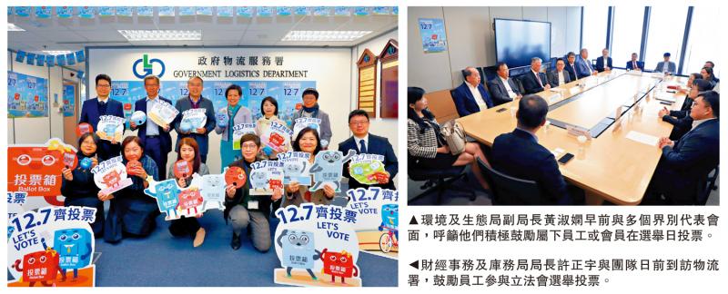 左圖:財經事務及庫務局局長許正宇與團隊日前到訪物流署,鼓勵員工參與立法會選舉投票。右圖:環境及生態局副局長黃淑嫻早前與多個界別代表會面,呼籲他們積極鼓勵屬下員工或會員在選舉日投票。