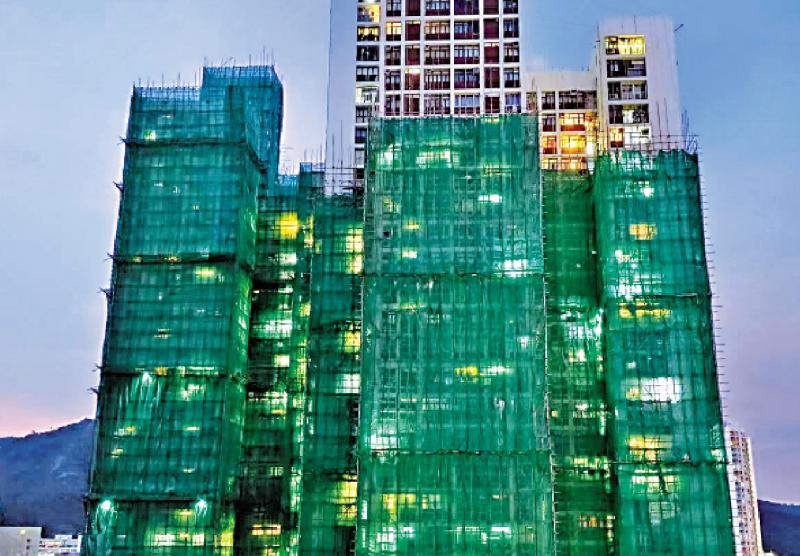 圖:火炭穗禾苑多棟大廈被棚網包圍。\大公報記者王亞毛攝
