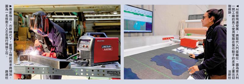 左圖:專家指出,AI新時代下,藍領工種的需求將增加。圖為一名技術工人正在進行焊接工作。\路透社;右圖:AI技術飛速發展,將取代入門級職位。圖為意大利一間工廠的員工使用電腦在製作鞋子的皮革上畫出切割痕跡。\法新社