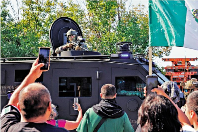 圖:一名移民執法人員4日在芝加哥用槍指着示威者。\美聯社