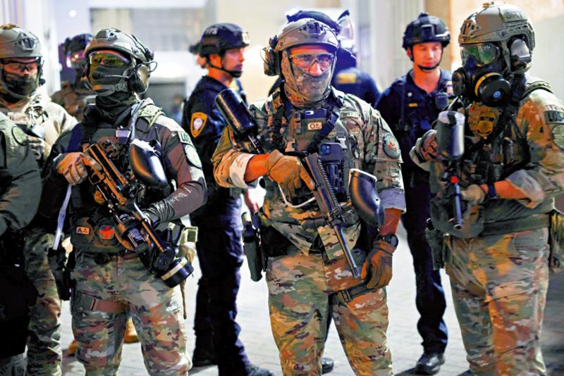 圖:聯邦執法人員6日守衛在波特蘭市的移民設施附近。\法新社