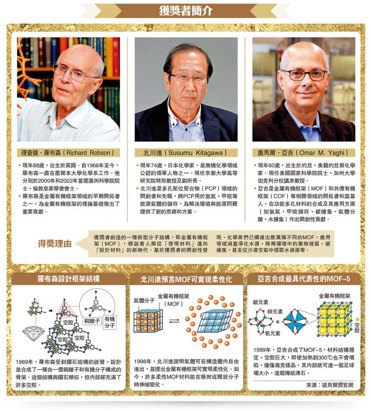 【大公報訊】金屬有機框架(MOF)是一種用途極其廣泛的超多孔納米材料,可用於儲存、分離、釋放氣體和其他化學物質。有專家認為,MOF對21世紀的重要性可能與塑料對20世紀的重要性一樣。羅布森、北川進和亞吉三位科學家開創了一種全新的分子建築學,使得金屬有機框架從偶然發現的結構,演變成可以理性建構的材料體系,可用於碳捕集、空氣取水和能源儲存等多個領域。