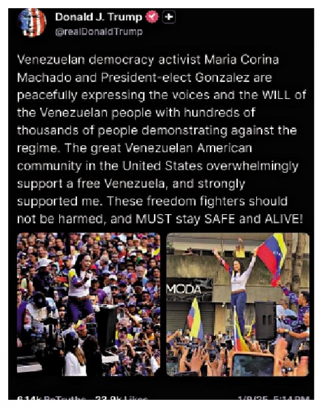 圖:特朗普曾在社交媒體聲援馬查多。\網絡圖片