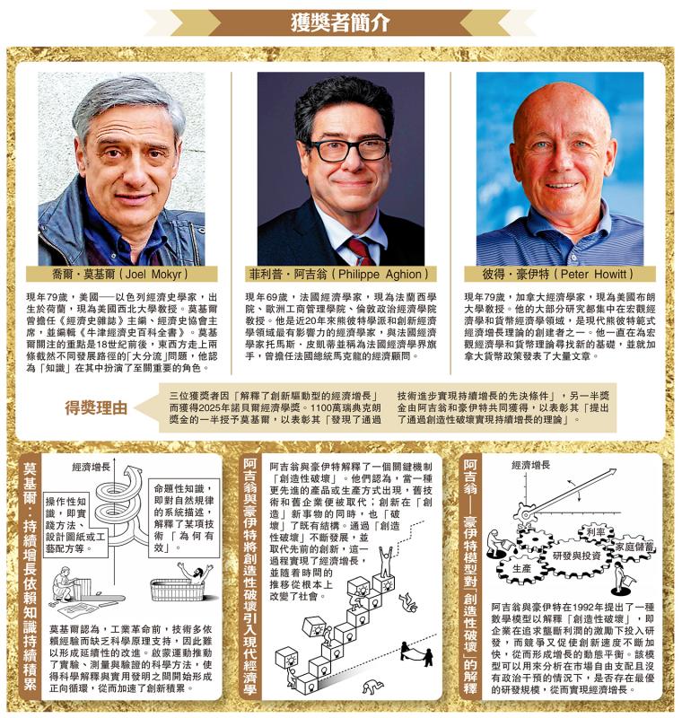 瑞典皇家科學院13日宣布,將2025年諾貝爾經濟學獎授予美以雙重國籍經濟學家莫基爾、法國經濟學家阿吉翁和加拿大經濟學家豪伊特,以表彰他們對「創新驅動經濟增長」理論的闡釋。在人工智能、機器人等新興技術蓬勃發展之時,三位獲獎者的研究不僅深化了人們對經濟長期增長的理解,也為當代發展問題提供了啟示。此外,得主批評美國總統特朗普的關稅政策阻礙經濟發展,而阿吉翁則呼籲歐洲在技術發展上學習中國。