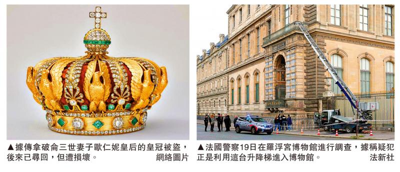 左圖:據傳拿破侖三世妻子歐仁妮皇后的皇冠被盜,後來已尋回,但遭損壞。\網絡圖片;右圖:法國警察19日在羅浮宮博物館進行調查,據稱疑犯正是利用這台升降梯進入博物館。\法新社