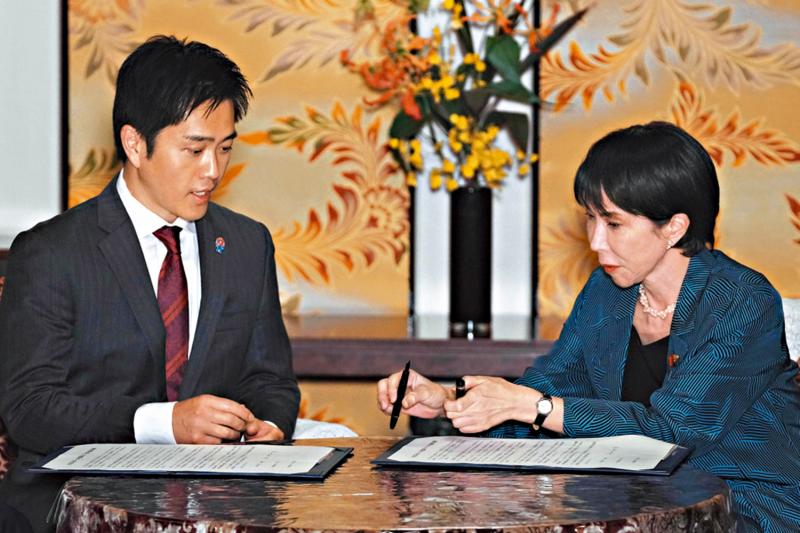 圖:日本自民黨總裁高市早苗(右)與日本維新會黨首吉村洋文20日簽署聯合執政協議文件。\法新社