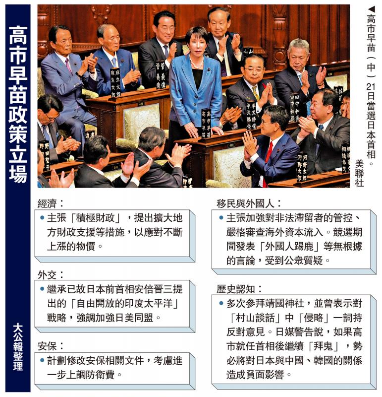 圖:高市早苗(中)21日當選日本首相。\美聯社