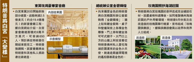 •白宮東翼20日開始拆除部分建築,啟動耗資2.5億美元(約合19.4億港元)的新宴會廳工程。據白宮網站介紹,白宮宴會廳總面積約9萬平方英尺,可容納650人,預計將在特朗普任期結束前完工。特朗普強調稱,該宴會廳將由特朗普和其他私人捐助者出資建造。