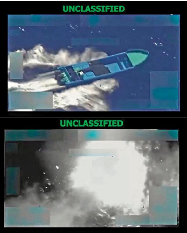 圖:美防長22日在X發布視頻,顯示美軍在太平洋擊沉「運毒船」。\法新社