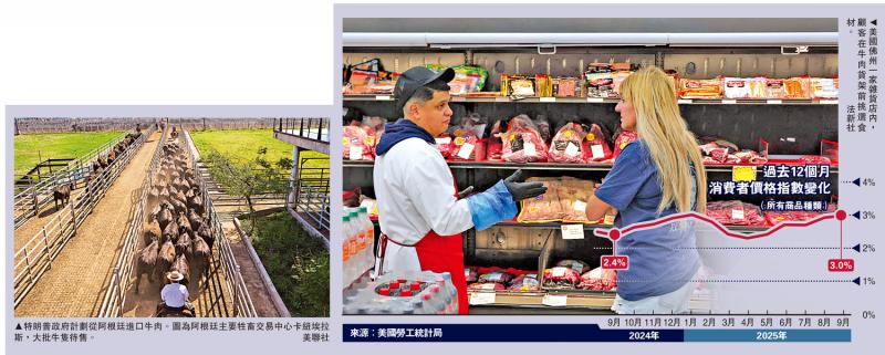左圖:特朗普政府計劃從阿根廷進口牛肉。圖為阿根廷主要牲畜交易中心卡紐埃拉斯,大批牛隻待售。\美聯社;右圖:美國佛州一家雜貨店內,顧客在牛肉貨架前挑選食材。\法新社