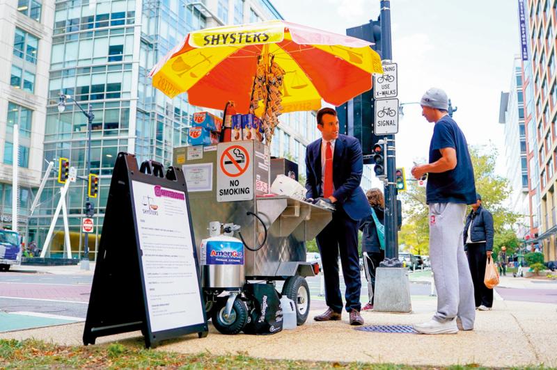圖:美國國稅局律師斯坦24日在美國首都華盛頓擺攤賣熱狗。\路透社