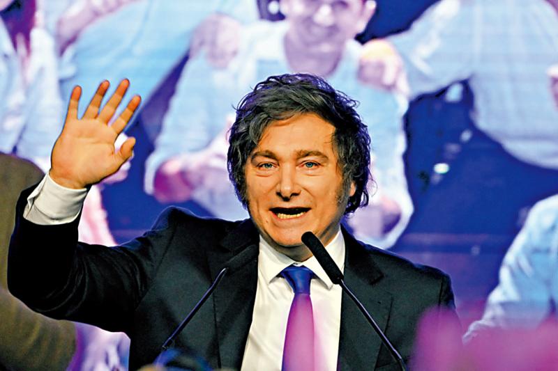 圖:阿根廷總統米萊26日在「自由前進黨」總部向支持者揮手致意。\法新社