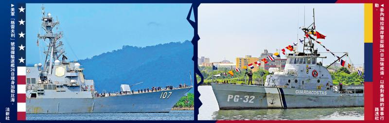 左圖:美軍「格雷夫利」號導彈驅逐艦26日現身加勒比海。\法新社;右圖:委內瑞拉海岸警衛隊26日加強戒備,以應對美國的軍事行動。\路透社