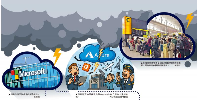 圖:(左至右)微軟位於巴黎郊外的法國總部。\美聯社;微軟旗下的雲端服務平台Azure於29日發生大規模宕機。\大公報融媒組AI製圖;英國希思羅機場受到此次微軟雲端故障影響。圖為旅客在機場排隊等候。\美聯社