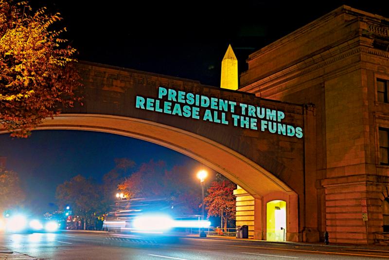 圖:美國農業部大樓外牆被投影標語,要求特朗普發放所有食品券資金。\美聯社