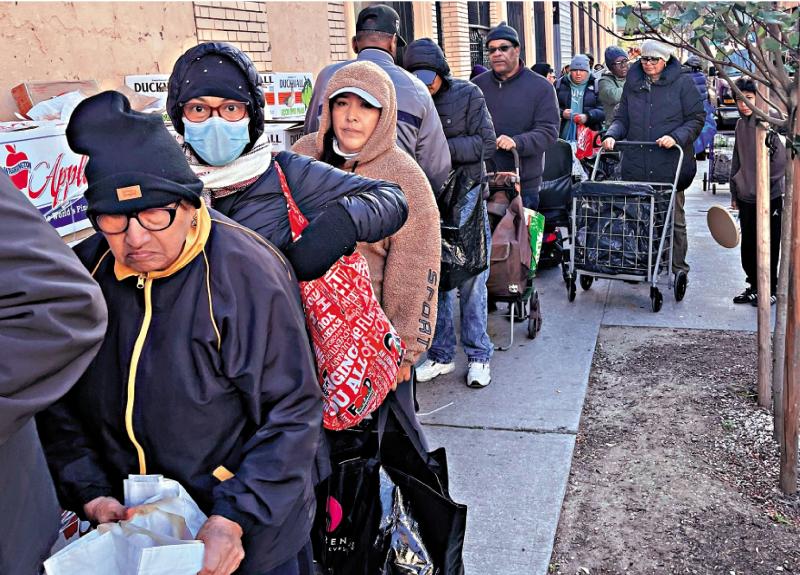 圖:美國政府停擺嚴重影響民生。圖為紐約市民1日排隊領救濟食品。/美聯社