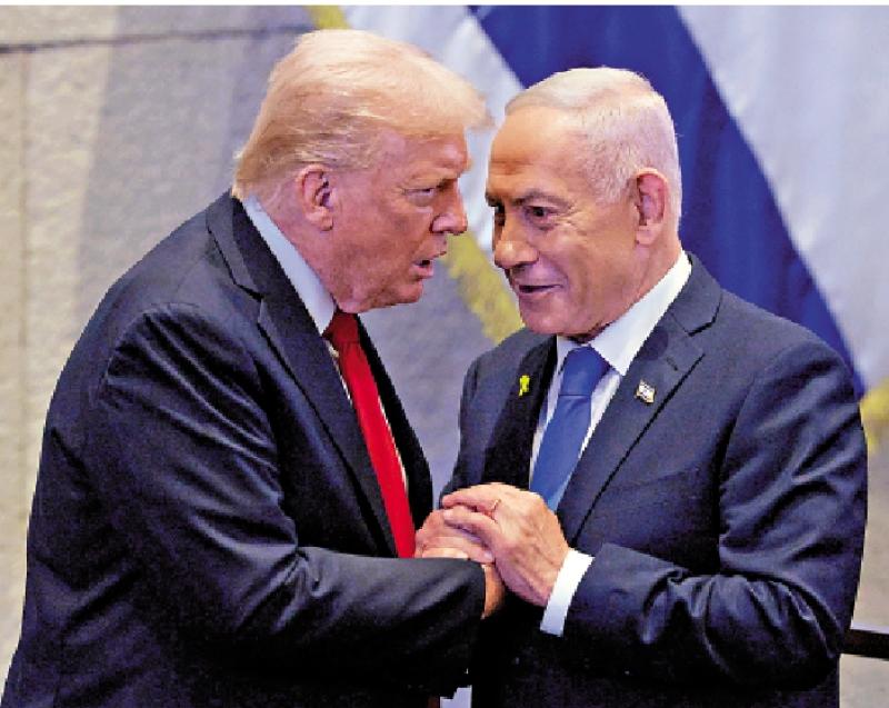 圖:特朗普(左)10月13日到訪以色列議會,與內塔尼亞胡會面。/美聯社