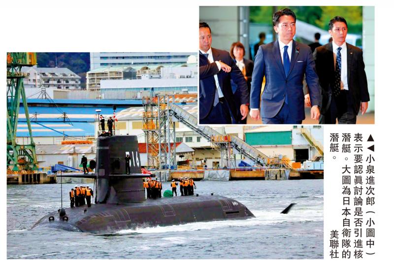 圖:小泉進次郎(小圖中)表示要認真討論是否引進核潛艇。大圖為日本自衛隊的潛艇。\美聯社