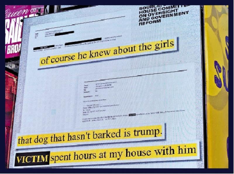 圖:紐約時報廣場的大屏幕上放出愛潑斯坦提及特朗普的電郵內容。\法新社