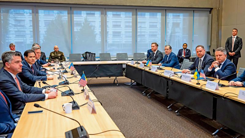 圖:美國代表團(左側)23日在日內瓦與烏克蘭代表團舉行會談。\美聯社