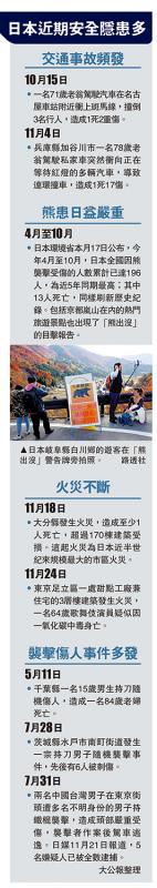•日本環境省本月17日公布,今年4月至10月,日本全國因熊襲擊受傷的人數累計已達196人,為近5年同期最高;其中13人死亡,同樣刷新歷史紀錄。包括京都嵐山在內的熱門旅遊景點也出現了「熊出沒」的目擊報告。