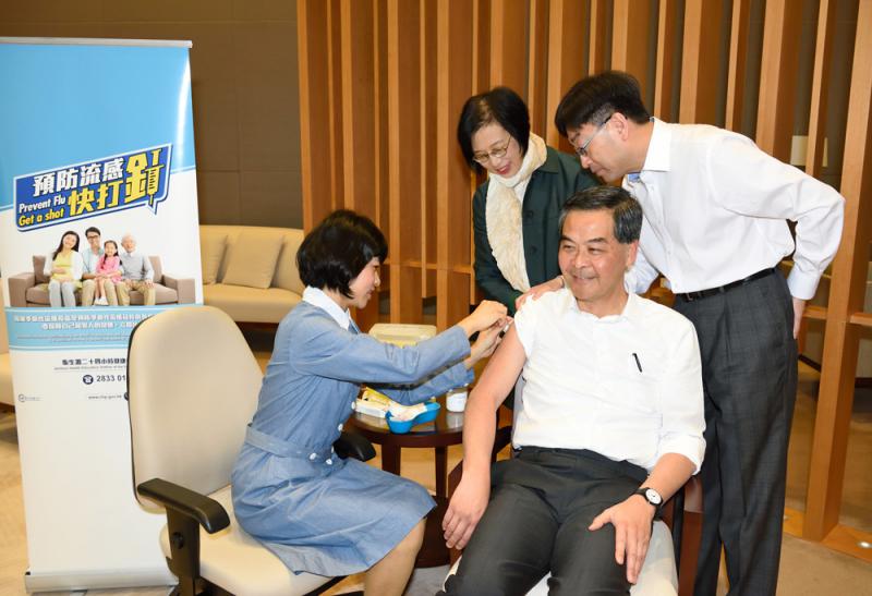 呢排天氣忽冷忽熱,大家都好易傷風。正所謂預防勝於治療,尋日特首梁振英(CY)就約埋五位主要官員,齊齊去打流感針,呢五位係:署理財政司司長陳家強、勞工及福利局局長張建宗、政制及內地事務局局長譚志源、保安局局長黎棟國,同埋創新及科技局局長楊偉雄。好多堅強嘅男人咩都唔驚,但係就最驚打針。不過呢,CY就一啲都唔驚,仲笑笑口添,梗係唔驚啦,原來CY身邊有兩位專家傍到實一實,佢哋咪就係食物及衛生局局長高永文醫生,同埋副局長陳肇始教授囉。