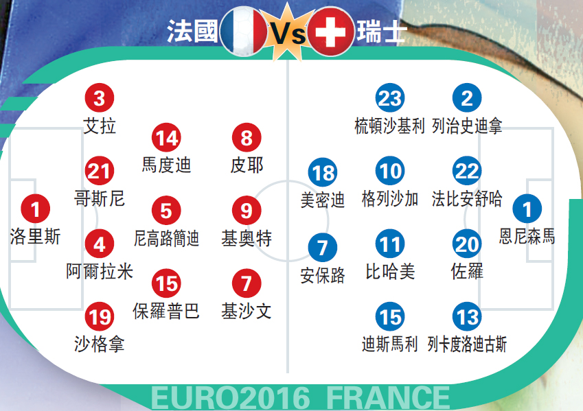 法國先後擊敗羅馬尼亞(勝2:1,基奧特、皮耶建功)及阿爾巴尼亞(勝2:0,基沙文、皮耶建功)後已積六分提早出線,面對積四分的瑞士,大家打和便各取所需。法國主帥迪甘斯應繼續讓部分主力休息,派遣新兵上陣考察也說不定。法國板?陣容足夠,即使以前鋒基格納出戰,水準相差不大。加上法國對瑞士往績為三勝三和,主場之利下是控制大局。上仗在下半場才入替的基沙文於補時入波證明自己身價,本屆歐國杯最當紅的皮耶連續兩仗為法國隊入波,今仗難有被棄用之理。不過,既然上仗已可列為後備,迪甘斯未必讓他們打足全場。舒尼達連、卡比耶、文加拉、烏密迪迪等邊緣替補球員或有機會落場一試身手。
