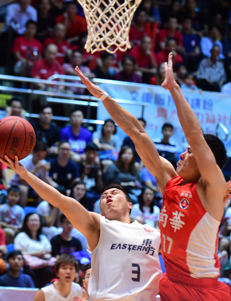 圖:東方男籃後衛李琪(左)上仗未懼南華黃德文封阻上籃得分\資料圖片
