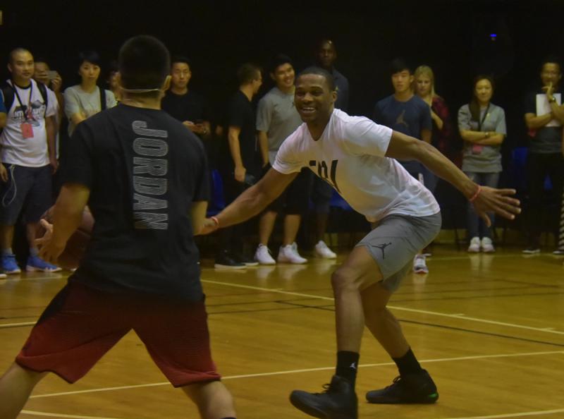 NBA雷霆球星「二少」韋斯博克昨天自北京抵港,進行一連兩天的交流活動,首天他便到達西灣河的協青社賽馬會大樓出席「Jordan Wings展翅飛翔活動」,與一眾小將打球交流,之後他又轉到理工大學指導一班大專生,所到之處歡呼聲不斷,「二少」在兩個活動中都勉勵年輕人要為夢想努力,也提醒香港學生要平衡讀書和運動。\大公報記者 梁潤森