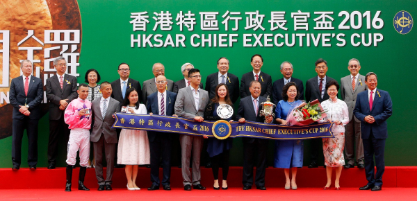 香港特別行政區行政長官夫人梁唐青儀女士、香港特別行政區政務司司長林鄭月娥女士、馬會主席葉錫安博士、眾馬會董事、行政總裁應家柏,及「永旺年年」的馬主代表及騎練,於香港特區行政長官杯頒獎禮上合照。大公報記者謝進亨攝
