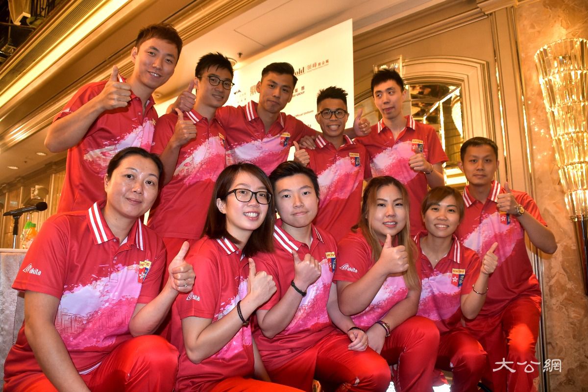 香港保齡球隊的胡兆康(後排左)及麥卓賢(後排右)在活動中與其他隊友合照