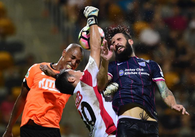 圖:元朗前鋒法比奧(左)與門將彭梓鍵(中)合力阻止傑志的馬高斯進攻 大公報記者李恆基攝