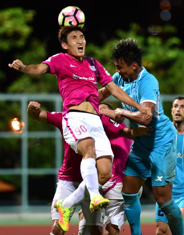 圖:傑志後衛金奉珍(左)阻止流浪基頓攻門 /大公報記者李恆基攝