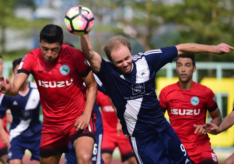 圖:港會球員羅比高(右二)使出「上帝之手」,防守南區的蘇沙攻門\大公報記者李恆基攝