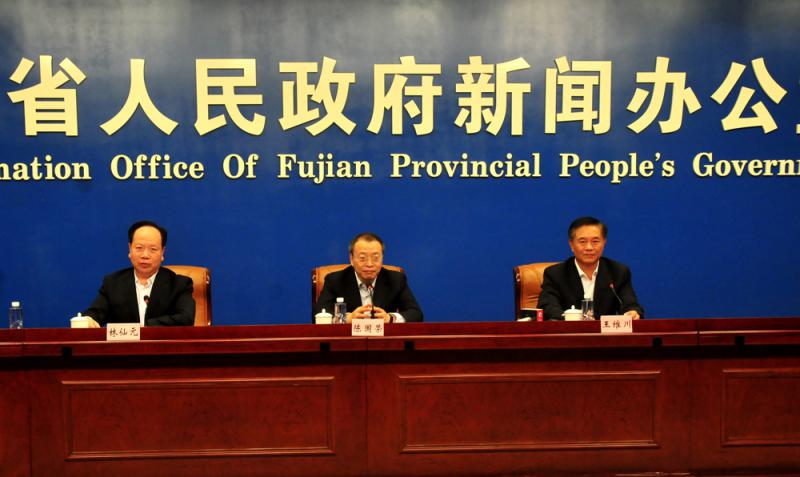 首屆世界杯武術套路賽組委會舉行新聞發布會,左起:福建省政府新聞辦副主任林仙元、國家體育總局武術管理中心主任陳國榮、福建省體育局局長王維川\大公報記者史兵攝