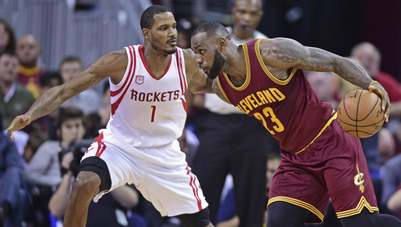 圖:騎士的勒邦占士(右)突破火箭艾列沙(左)的防守\美聯社