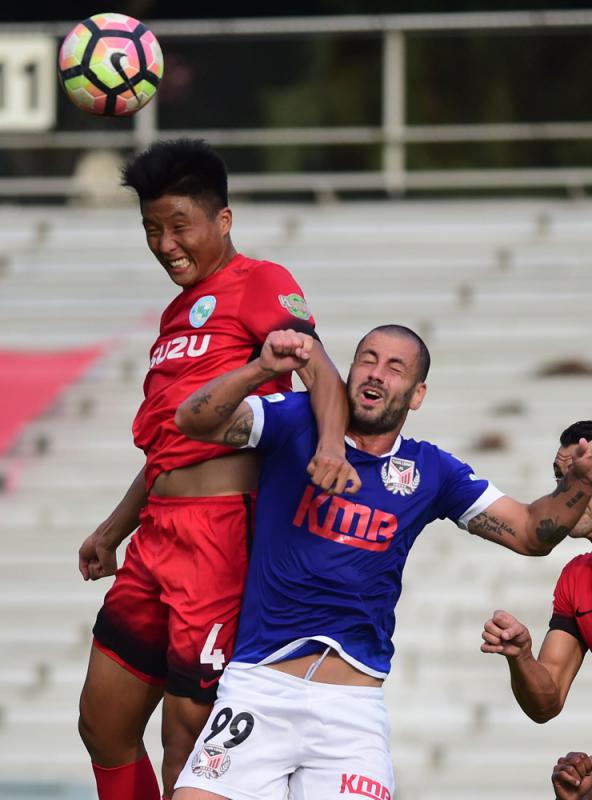 圖:南區劉學銘(左)力壓元朗雲迪奴域頭槌攻門/大公報記者李恆基攝